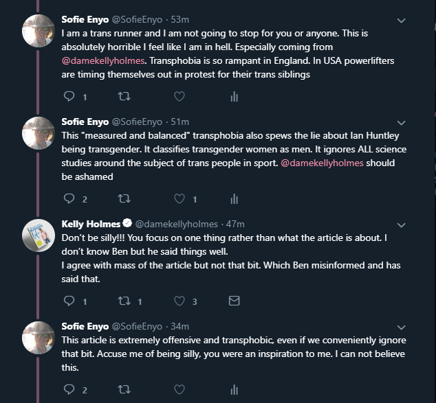 I found out today that Kelly Holmes, an inspiration of mine, believes that trans women are males and shouldn’t be allowed to compete. She agrees with this completely transphobic thread. “they would be my words exactly”