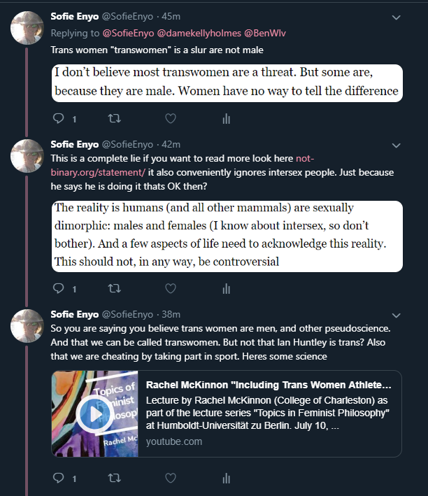 I linked the thread in question above. On twitter I also pointed towards the scientific studies around trans people participating in sports. Something surprisingly few (read none) are willing to do before using their platform to tell the world we are cheaters.
