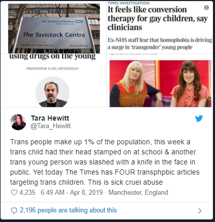 Last Sunday (07/04/19) the times alone had 4 anti-trans hit pieces, targeting the only NHS service and the only charity for trans adolescents.
