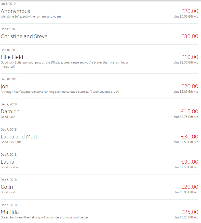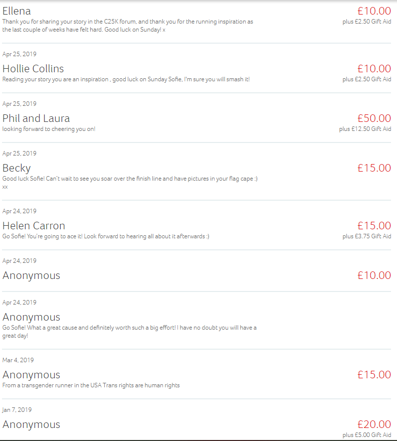 I want to thank everyone who donated, which is what made this so amazing, raising money for the LGBT foundation, including Stafani who donated offline as well as all those below. Thanks also to the Virgin Money Lounges Manchester and Jennifer Quinn for giving places to the LGBT foundation for the London Marathon and providing lots of support with fundraising. Thanks to Solomons bar on Wilmslow road, Mary and Archie bar of Burton road Manchester for hosting collection boxes and being extremely nice as well as everyone who donated that way! Everyone who has supported me, Didsbury Runners and Cafe Diagnosis.