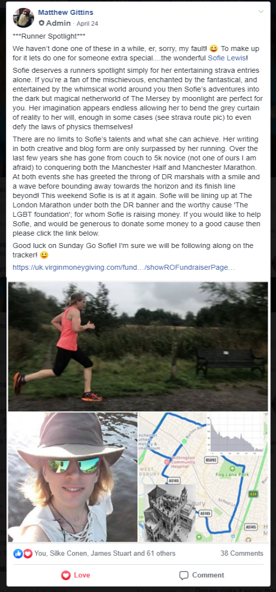 I want to thank everyone who donated, which is what made this so amazing, raising money for the LGBT foundation, including Stafani who donated offline as well as all those below. Thanks also to the Virgin Money Lounges Manchester and Jennifer Quinn for giving places to the LGBT foundation for the London Marathon and providing lots of support with fundraising. Thanks to Solomons bar on Wilmslow road, Mary and Archie bar of Burton road Manchester for hosting collection boxes and being extremely nice as well as everyone who donated that way! Everyone who has supported me, Didsbury Runners and Cafe Diagnosis.