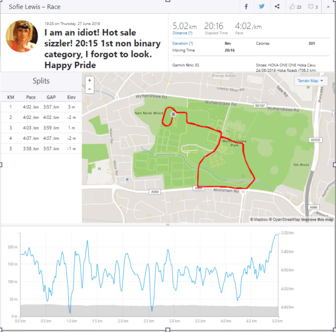 Not too bad, I wasn’t worried, it was about 22 degrees, one of the first hot days of the year and I was close. I also forgot that I had entered as a non binary runner, it was the first time they had included this category and I am proud to be the first runner to finish sale sizzler in the non-binary category.