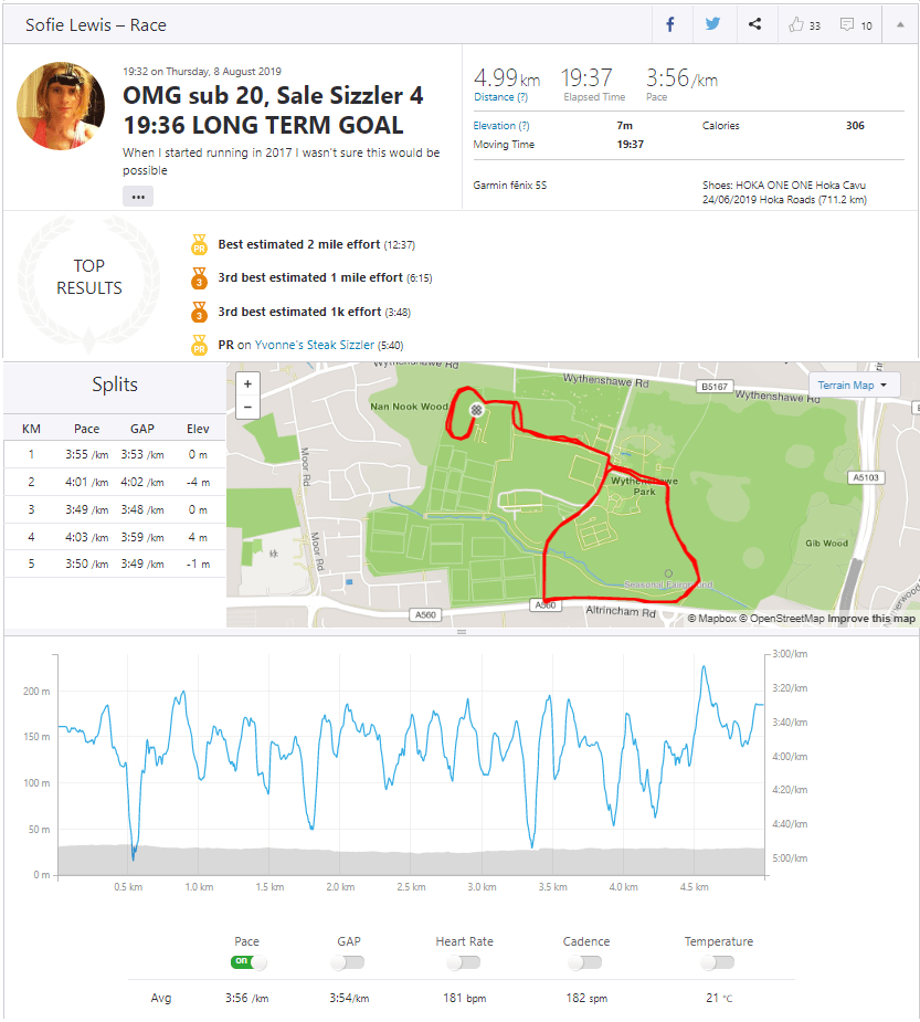 My next 5k PB was exactly 20 minutes in august last year (2018). This was my first sale sizzler, and I really enjoyed it. I was super happy getting a 20 minute 5k, still it left me with just 1 second to knock off for a sub 20.
